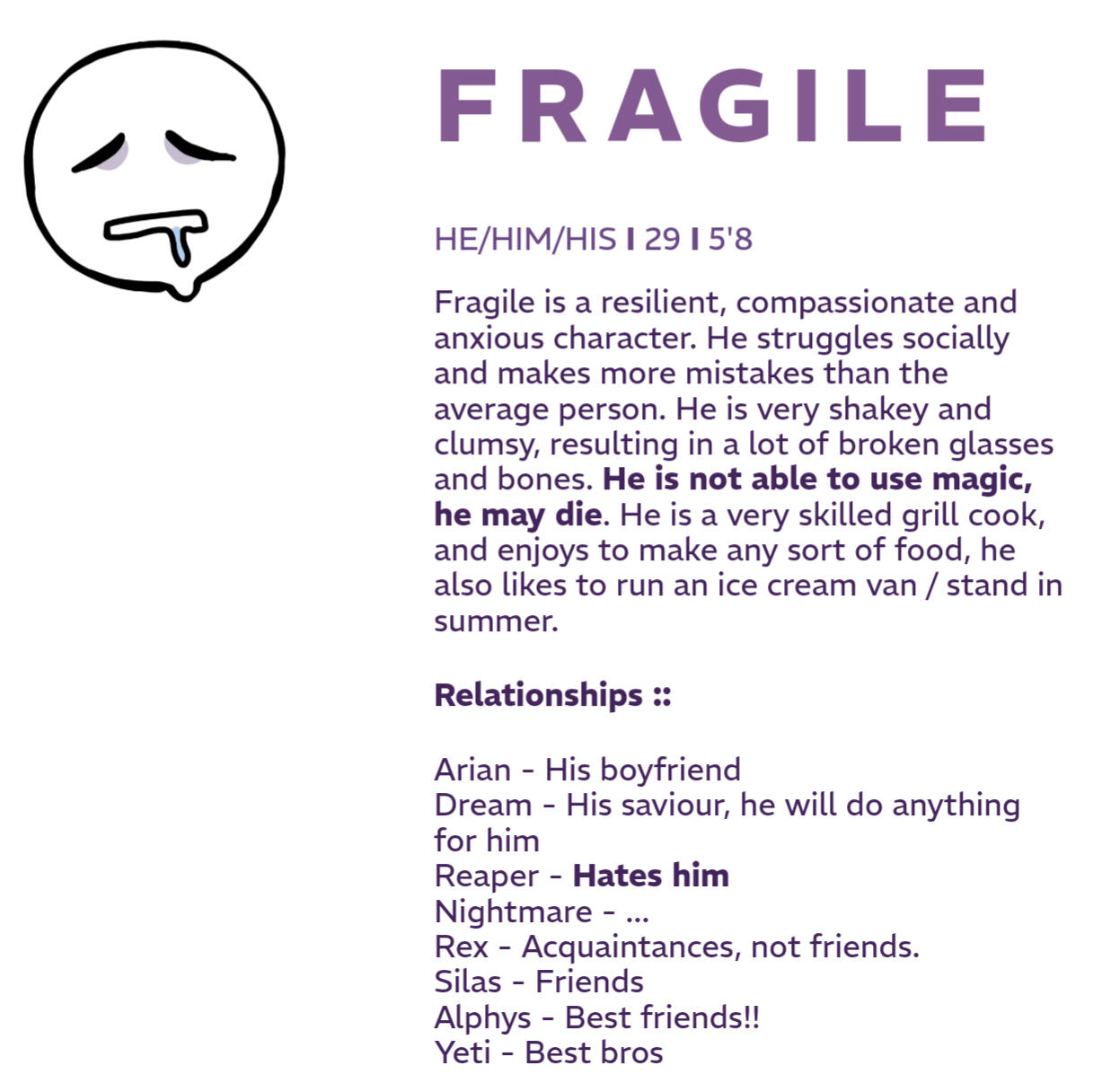In a world where Fragile's father, Gaster, once a beacon of hope, creates a machine to liberate monsters from the underground, tragedy strikes. The machine's malfunction fills the underground with deadly gas, leaving Fragile and Gaster bedridden and weak.Gaster's demise dawns upon Fragile, leaving him alone, save for his unaffected brother Papyrus, whom was healthy and too young to understand. They find refuge with the royal family, where Fragile forges an unlikely bond with Alphys, who becomes his lifeline.However, their tranquil life is disrupted by the arrival of Chara, whose friendship with Asriel only exacerbates Fragile's isolation. As tensions escalate, tragedy strikes again, tearing the royal family apart, leading to the divorce of King Asgore and Queen Toriel. Also leading to the demise of Chara and Asriel, and Fragile felt nothing, he believed they deserved it after the torment he recieved.Fragile blamed Gaster for the catastrophe.Years later, as Fragile comes of age, haunted by his sickness and past resentments, a chance encounter with a compassionate human sparks hope for reconciliation.