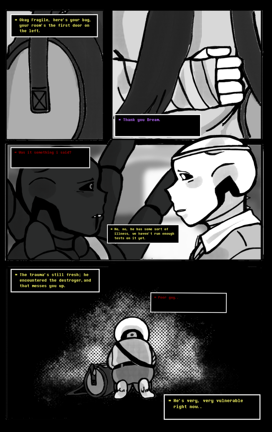 In the depths of the underground, Fragile's world is turned upside down as he wakes up in his bed, only to realize that everything he knew has been reset. Confusion grips him as he recalls his previous life on the surface, where he ran a hotdog stand and reveled in happiness and health. But now, back in his underground abode, he is confronted with a stark reality - he looks horrible, and his surroundings feel foreign.The familiar slam of his door echoes through the room as Papyrus bursts in, mirroring the day Frisk first arrived. Fragile's sense of déjà vu is unsettling as Papyrus repeats the same actions, leaving him bewildered and alone once again. With a heavy heart, Fragile prepares to venture out into the unknown, guided by Alphys' theory that his world has been reset, leaving him as the sole bearer of this knowledge.Returning to his usual spot, Fragile encounters the human once more, but something is different this time. Despite his attempts to reconcile, their interaction takes a dangerous turn, resulting in Fragile sustaining a broken arm. Panicked and overwhelmed, he seeks solace in Papyrus, who surprisingly shows concern for Fragile's well-being.As tensions escalate and Papyrus faces off against the human threat, Fragile watches in horror as his brother falls in battle. With fear coursing through his veins, Fragile flees, pursued relentlessly by the human. As a monster unable to wield magic, he is at a disadvantage, his only instinct survival as he races towards safety.Just when all hope seems lost, a ray of hope appears in the form of a skeleton clad in yellow. Dream, a guardian of alternate universes, intervenes, saving Fragile from certain demise. Together, they escape through a portal as the underground trembles with the impending arrival of a mysterious entity known as the destroyer.Awakening in a hospital bed, Fragile is greeted by Alphys and the enigmatic Dream, who explains his role as a guardian and offers Fragile a new home in the Omega timeline. Overwhelmed by the kindness and hospitality extended to him, Fragile is hesitant yet grateful for this unexpected turn of events.As Fragile grapples with the reality of his new life, he is introduced to Arian, a renowned bounty hunter and council member who resides in the house provided for him. Despite initial apprehension, Fragile is reassured by Dream's words and embraces the opportunity for a fresh start in a world filled with unknown wonders and dangers alike.